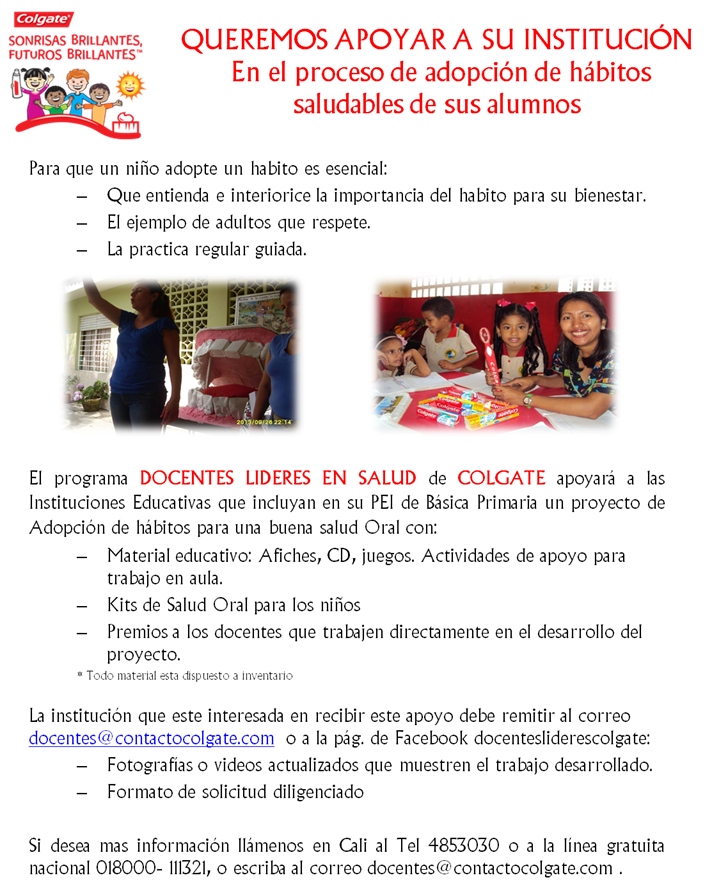 El programa Docentes Líderes en Salud de Colgate, apoyará a las instituciones que incluyan en su PEI un proyecto de adopción de hábitos saludables para una buena salud oral: