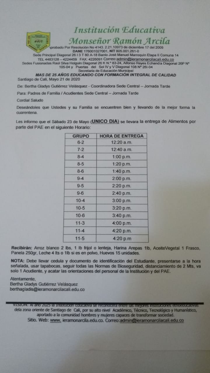 ATENCIÓN AL HORARIO DE ENTREGA DE ALIMENTOS DE LA SEDE CENTRAL JORNADA TARDE: