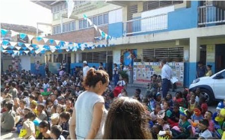 en la día 27/mayo/16 de les da la bienvenida con una ceremonia a los estudiantes de la jornada mañana con nuestros himnos nacionales